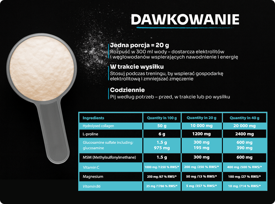 - ⚡ Synergia z witaminą C – witamina C wspiera prawidłową produkcję kolagenu dla skóry, kości i chrząstki.