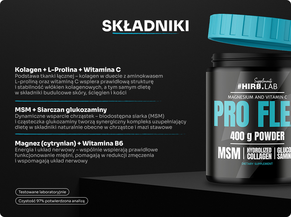 - ⚡ Codzienne wsparcie ruchu – formuła zawiera składniki, które naturalnie występują w chrząstkach i tkankach łącznych.